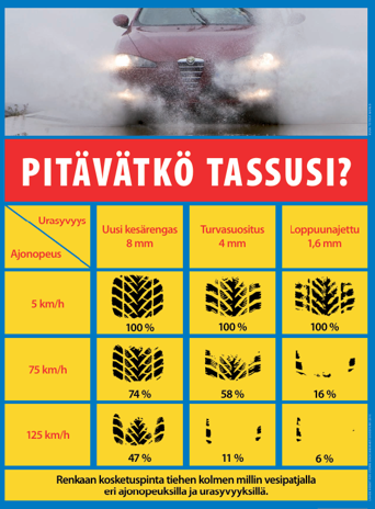 - Huomioi myös, että autossa on vuodenaikaan sopivat renkaat. Kesärenkaat ovat suunniteltu poistamaan tehokkaasti vettä renkaan ja tien välistä. Talvirenkaiden, sekä kitkan että nastan, ominaisuudet ovat erilaiset ja ne käyttäytyvätkin vesikelillä eri tavalla.